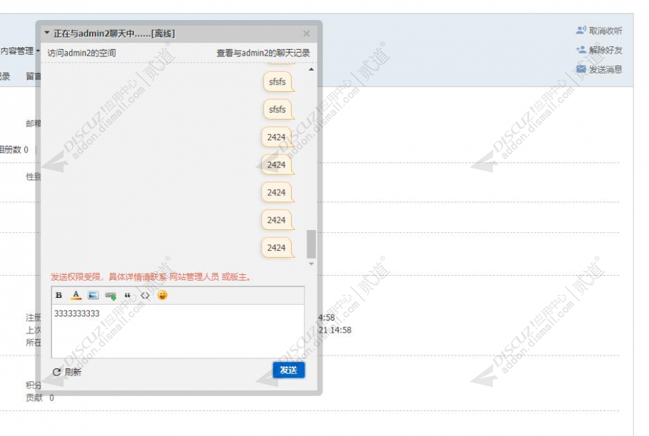 3、支持 设置好友不受限,即 给受限用户组成员 给自己好友发送站内信息时,将不再收 接收用户组 限制。