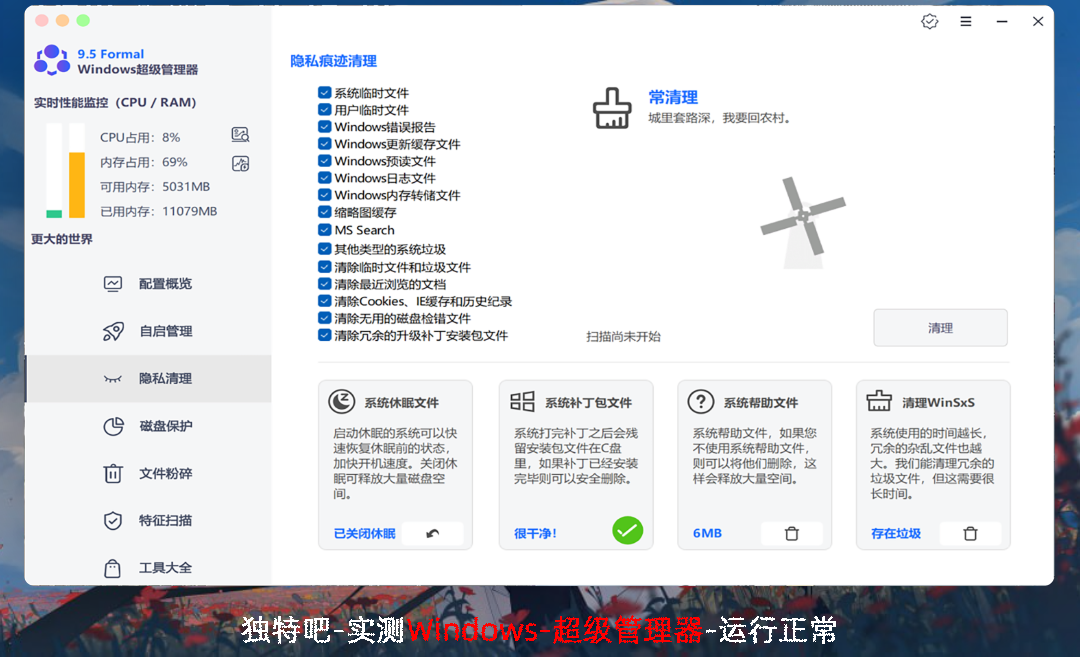 在当今复杂多变的数字环境中,Windows 电脑用户常常面临系统卡顿、启动缓慢、隐私泄露、硬件信息不透明等诸多问题。虽然系统自带的任务管理器和设置功能可以满足基本需求,但对于希望深入掌控电脑状态、进行精细化管理的用户而言,这些工具显然力不从心。为此,Windows超级管理器 v9.5.1.0 中文绿色版 应运而生——这是一款专为 Windows 用户打造的综合性系统管理工具,集实时性能监控、硬件信息查看、开机自启管理、隐私清理、磁盘保护、文件粉碎、安全扫描与多功能工具箱于一体,堪称电脑用户的“全能管家”。